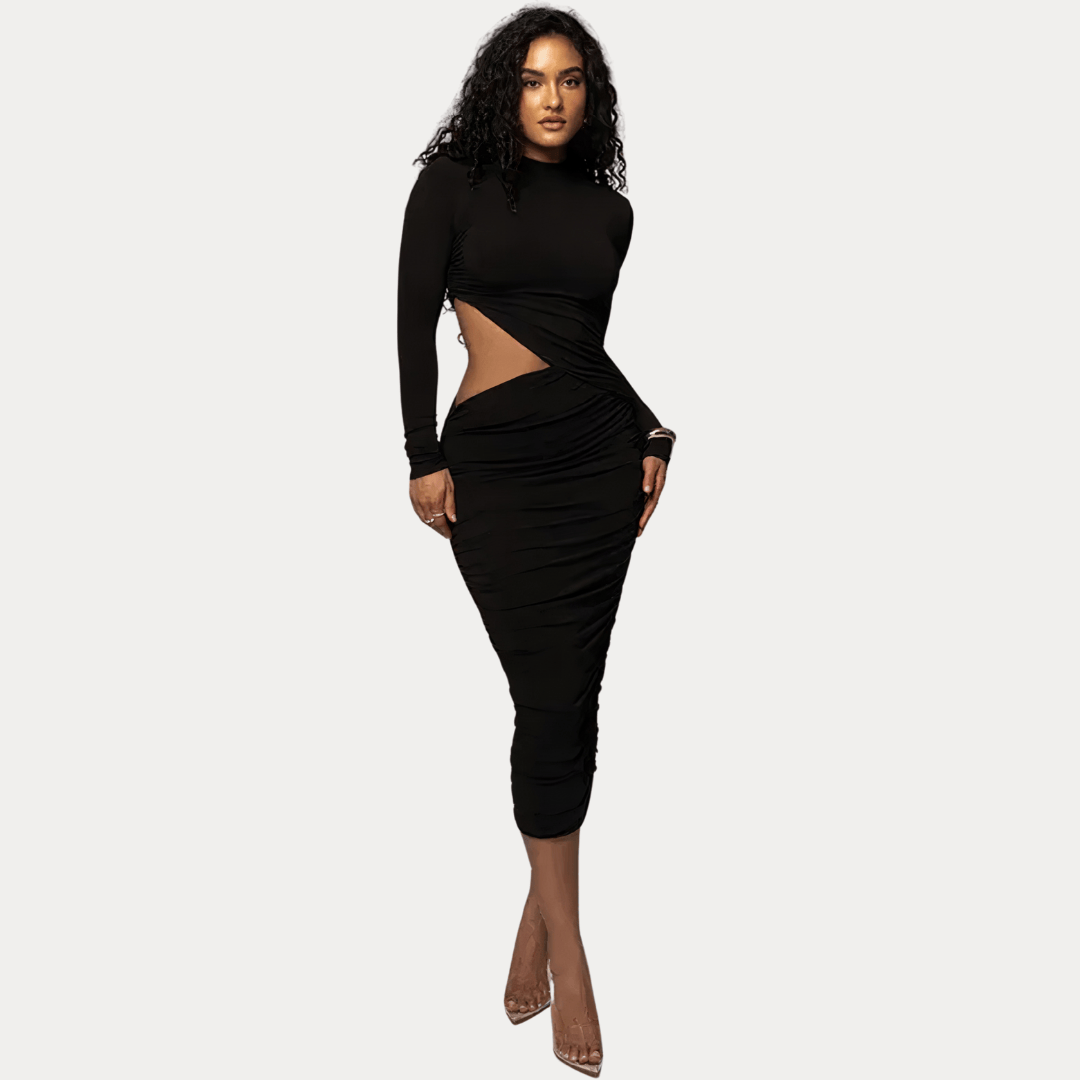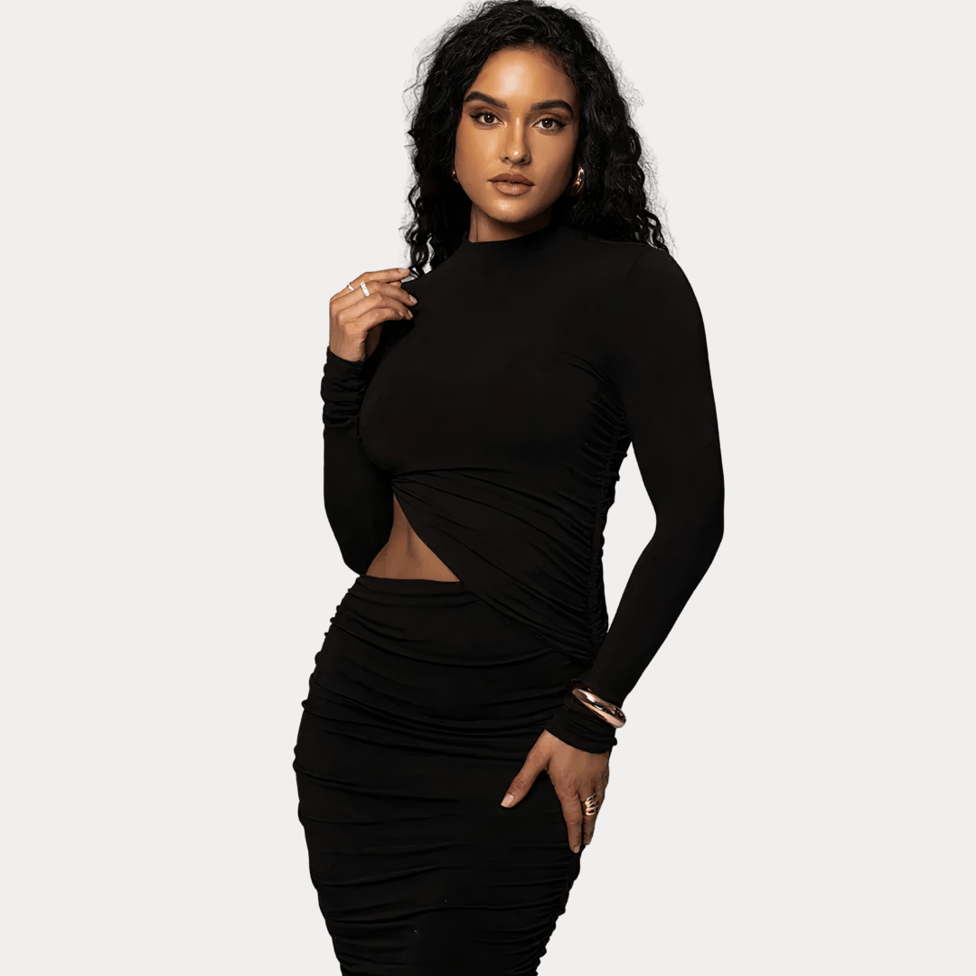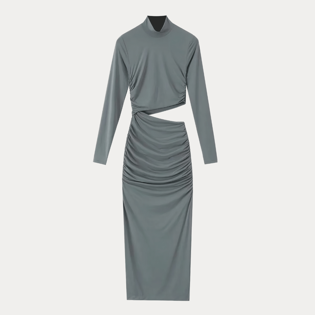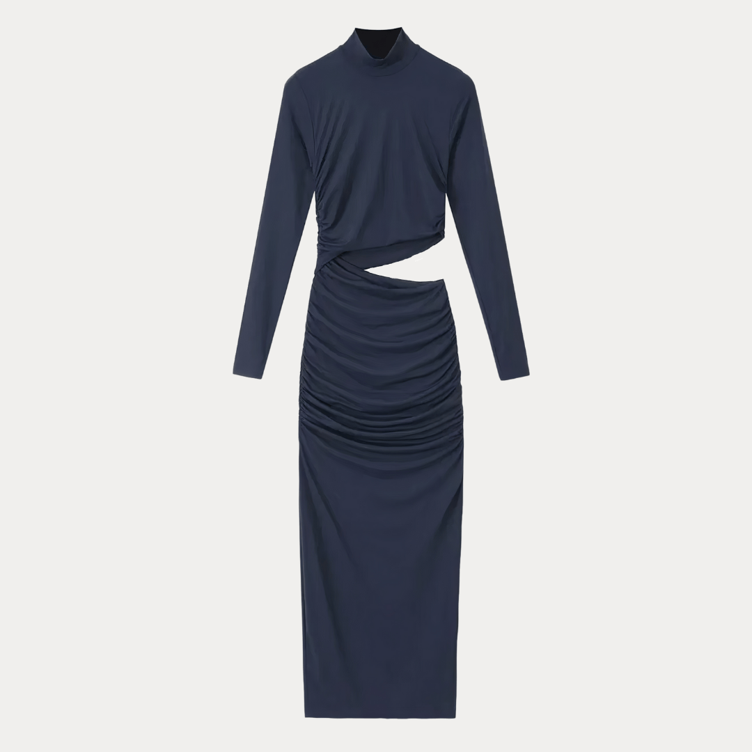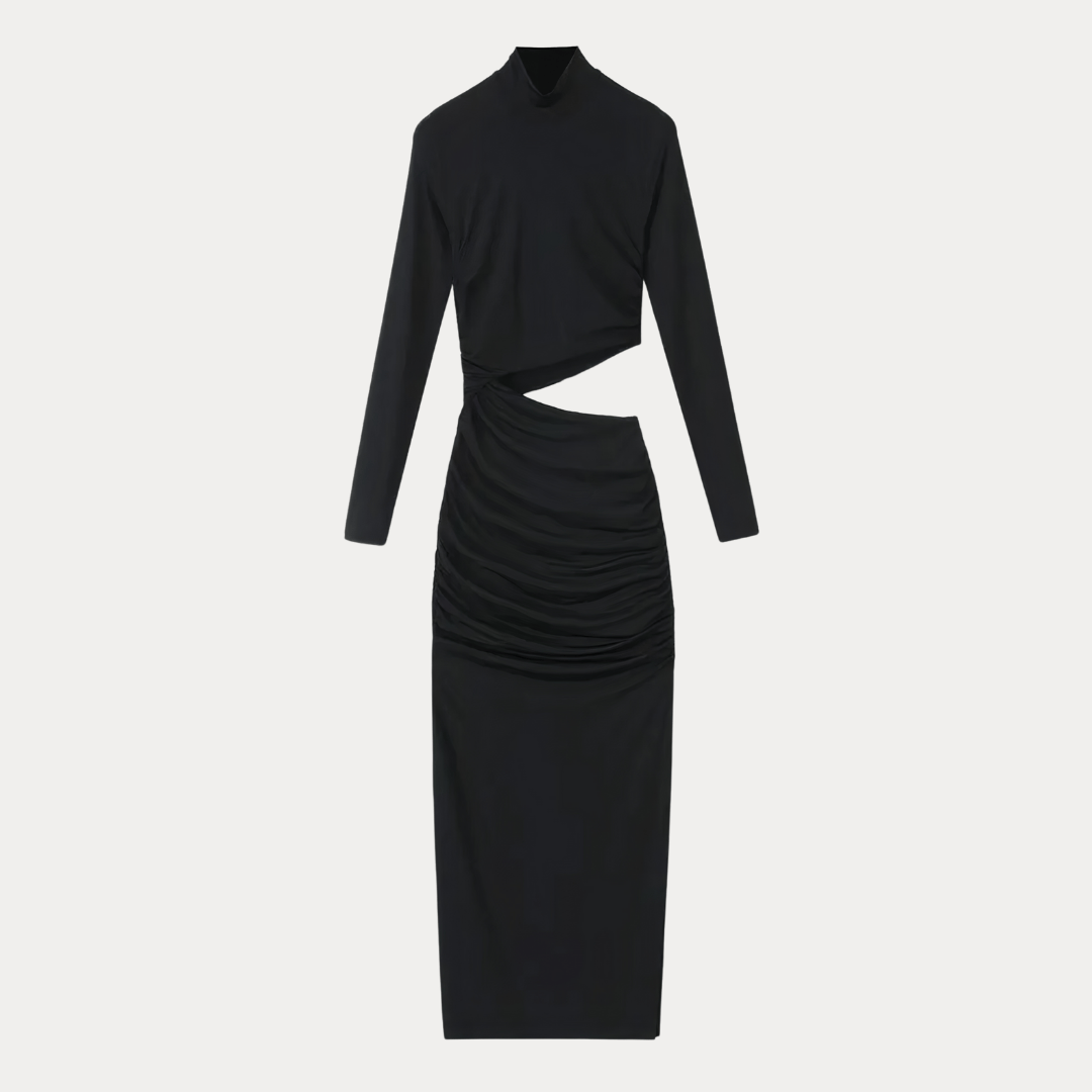 Design attillato ed elegante. Maniche lunghe. Gonna di lunghezza media. Spacco sul fianco destro. Colletto dolcevita. Tessuto morbido. Vestibilità aderente e raffinata ideale per le tue uscite serali più iconiche.
