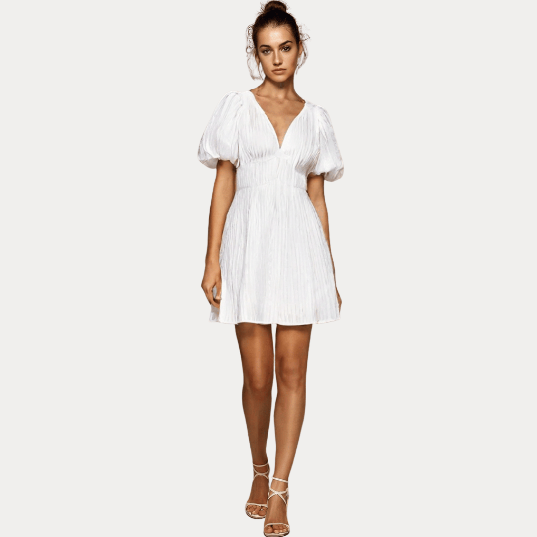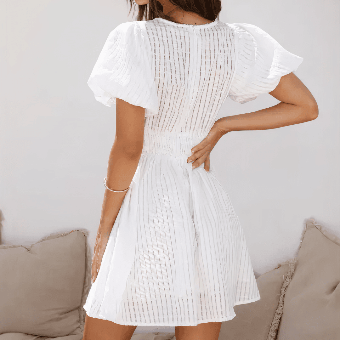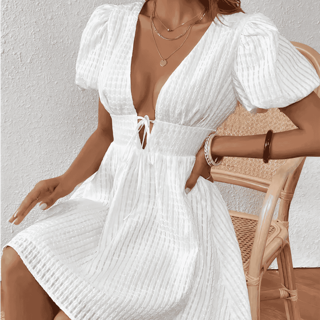 Design con scollo a V. Maniche corte a sbuffo. Sarò ampia. Chiusura invisibile con cerniera a zip dietro la schiena. Tessuto leggero e traspirante. Restringimento sui fianchi con lacci. Vestibilità elegante e rilassata.