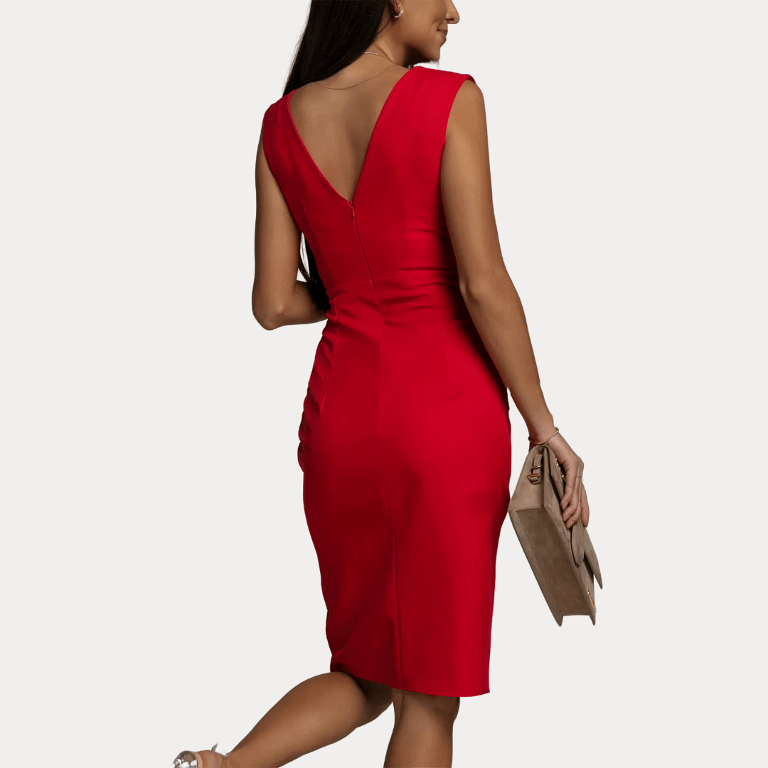 Design lungo. Design aderente. Senza maniche. Schiena scoperta. Chiusura con cerniera posteriore. Scollo a V