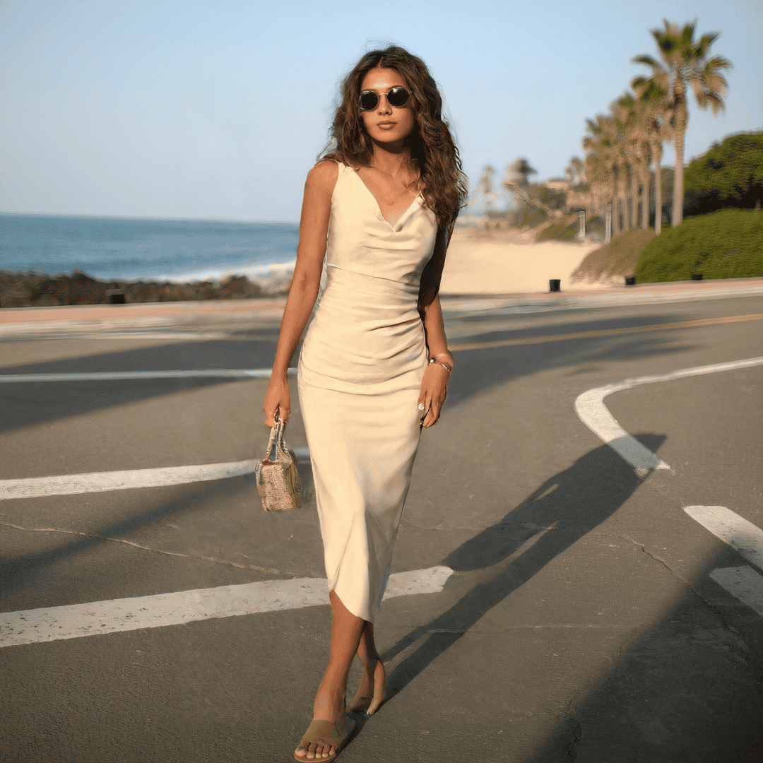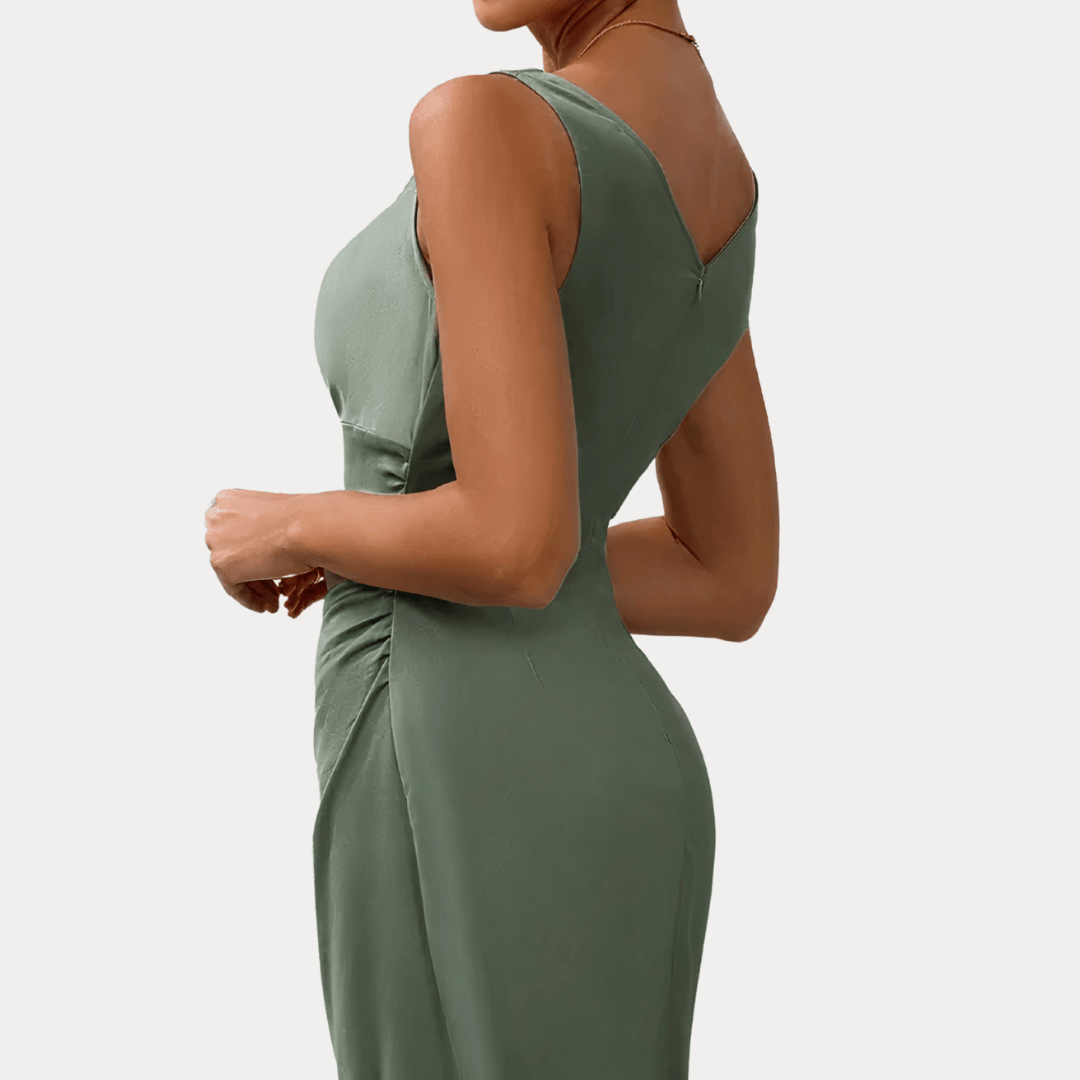 Design lineare sul corpo . Scollo a V. Senza manica. Tessuto in seta. Vestibilità elegante e aderente. Chiusura posteriore con cerniera.
