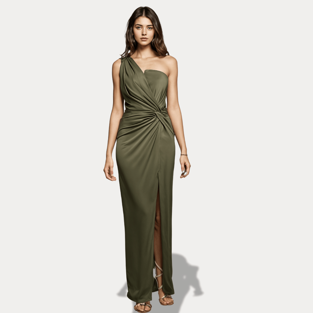 Abito monospalla in raso con legatura sul polso destro, gonna lunga con spacco sul finale linea cerimonia, tessuto in raso molto elegante.