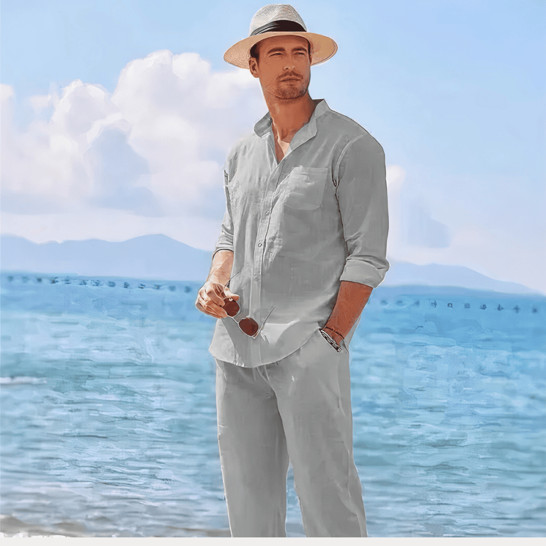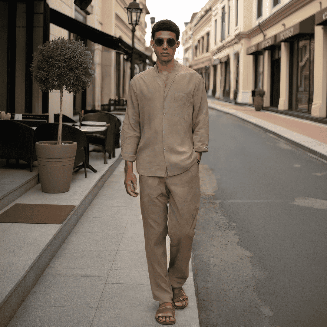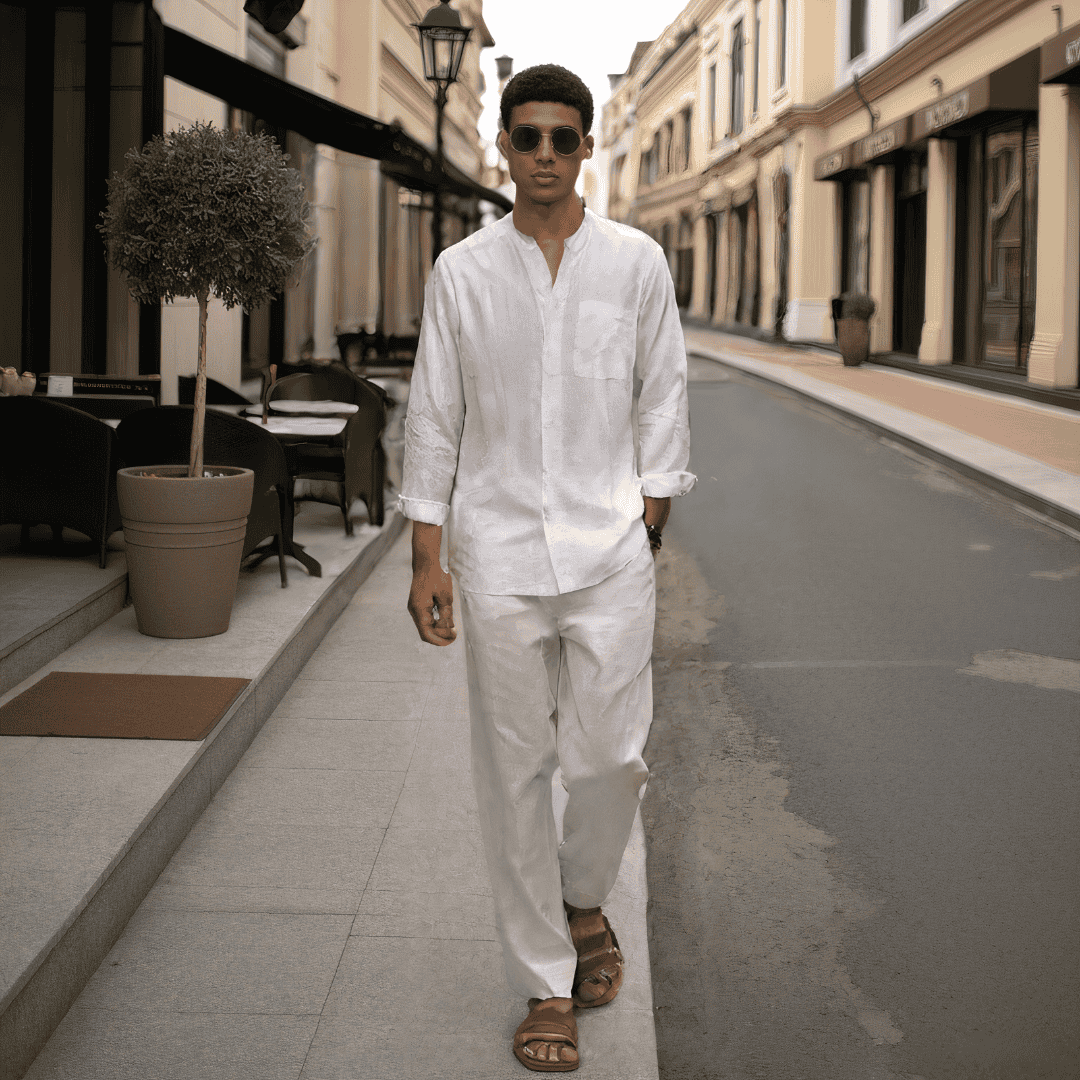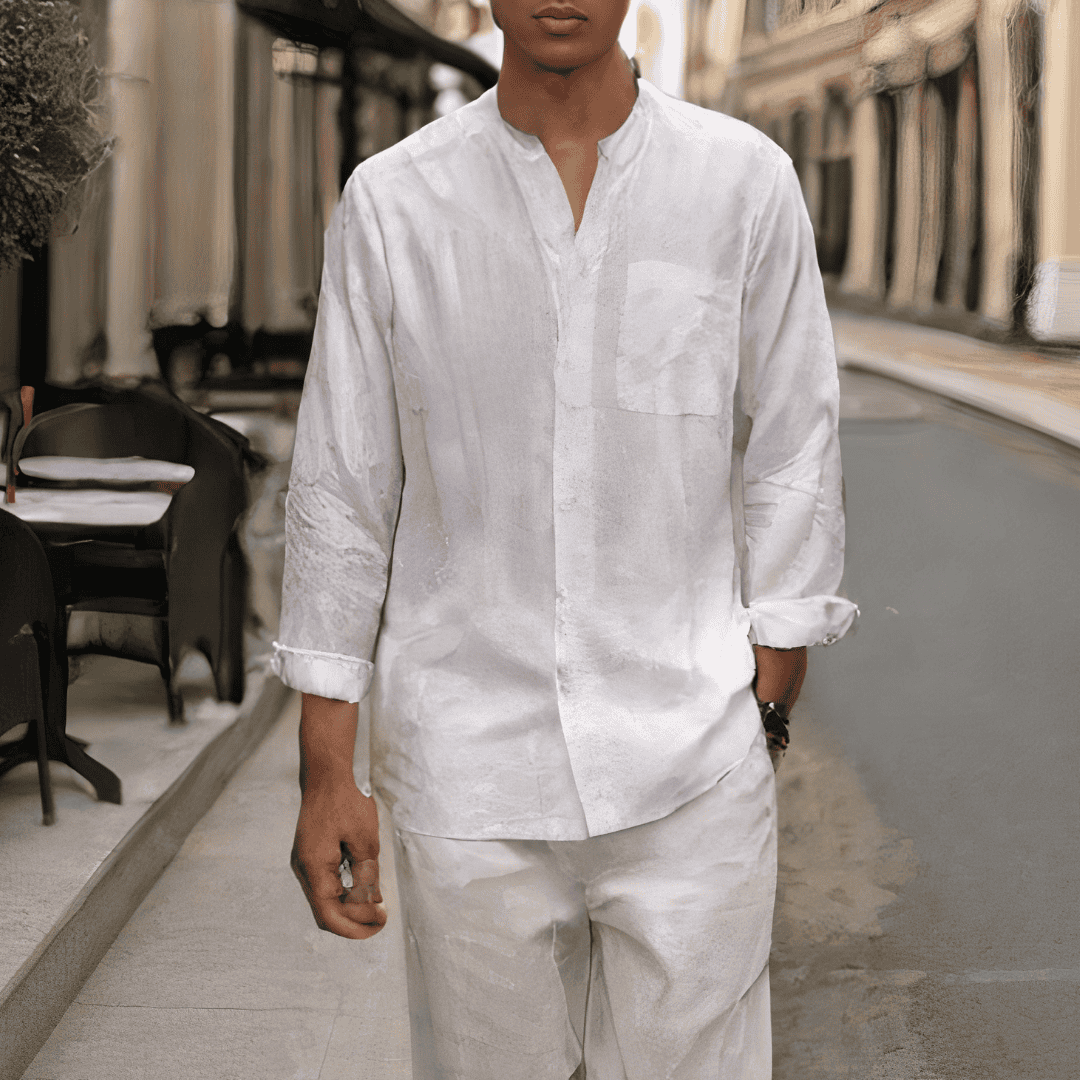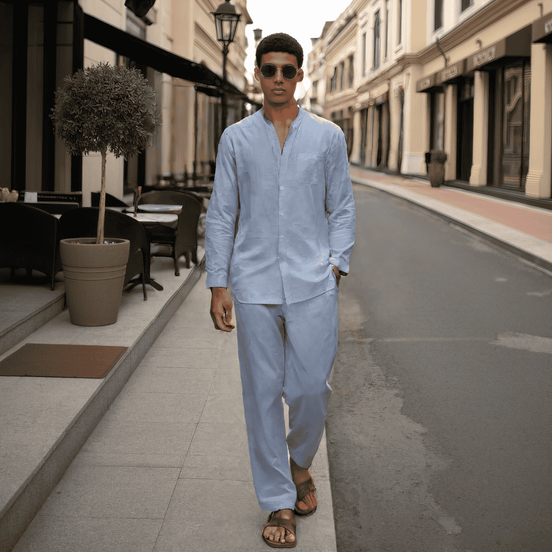 Taglio dritto. Vestibilità rilassata e comoda. Manica lunga con chiusura a bottone sull'orlo. Colletto in stile coreano. Camicia con taschino sulla destra. Pantaloni con due tasche laterali.
