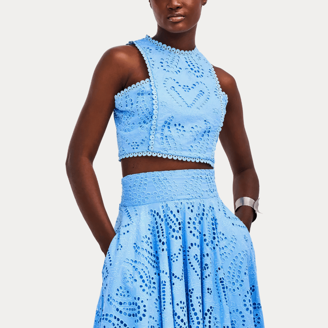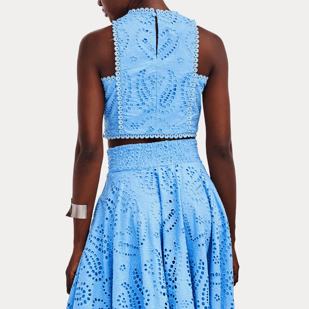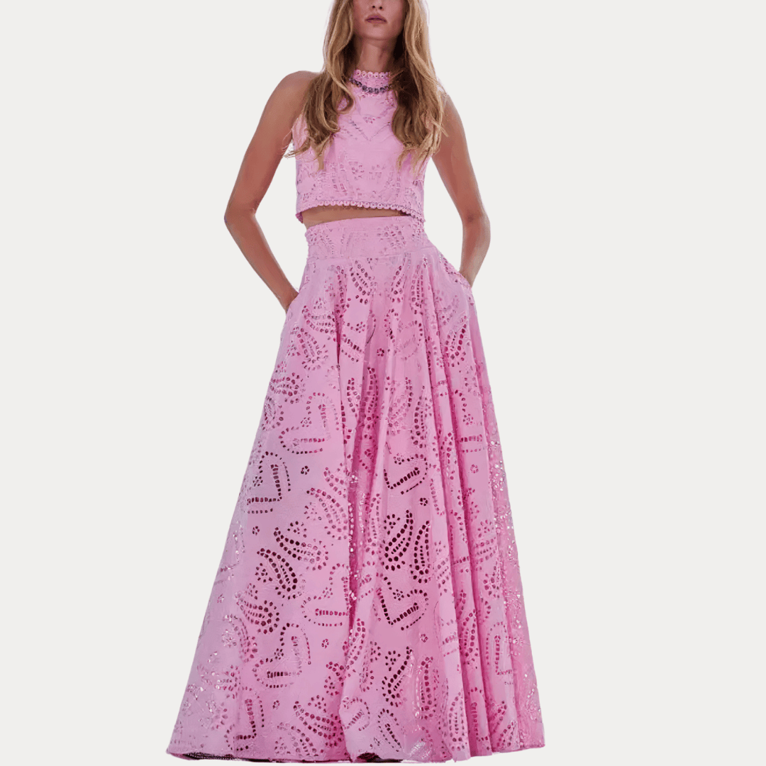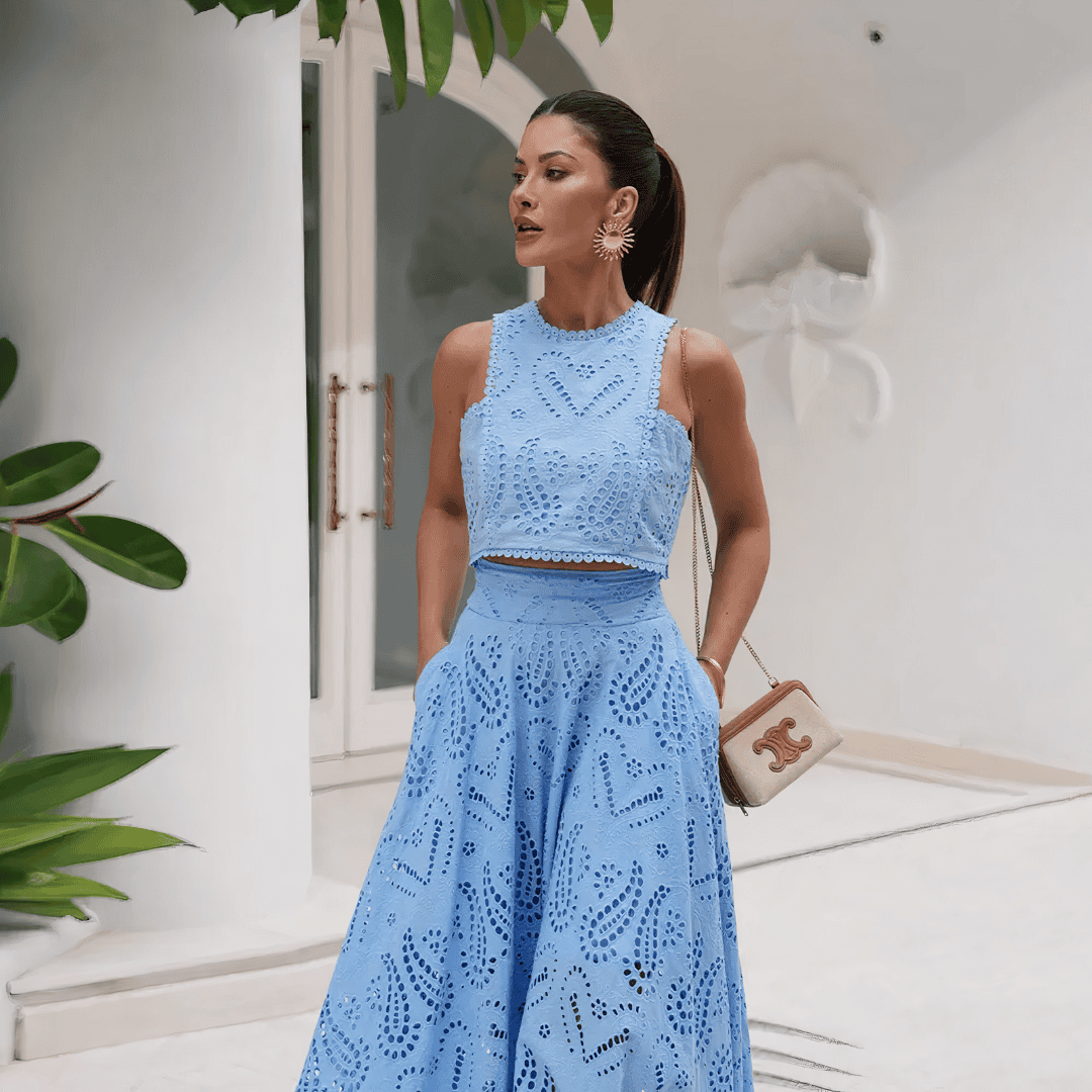 Design in pizzo con ricami. Top senza maniche. Girocollo con ricamo. Chiusura superiore su bottone singolo posteriore. Gonna lunga. Fascia vita elasticizzata. Tessuto in stoffa ultra traspirante. Vestibilità casual e particolare.