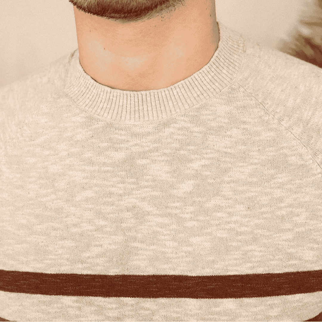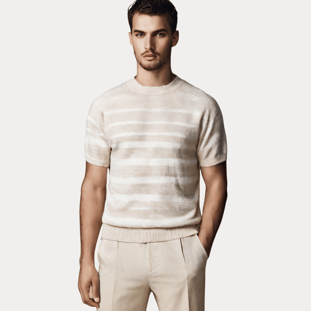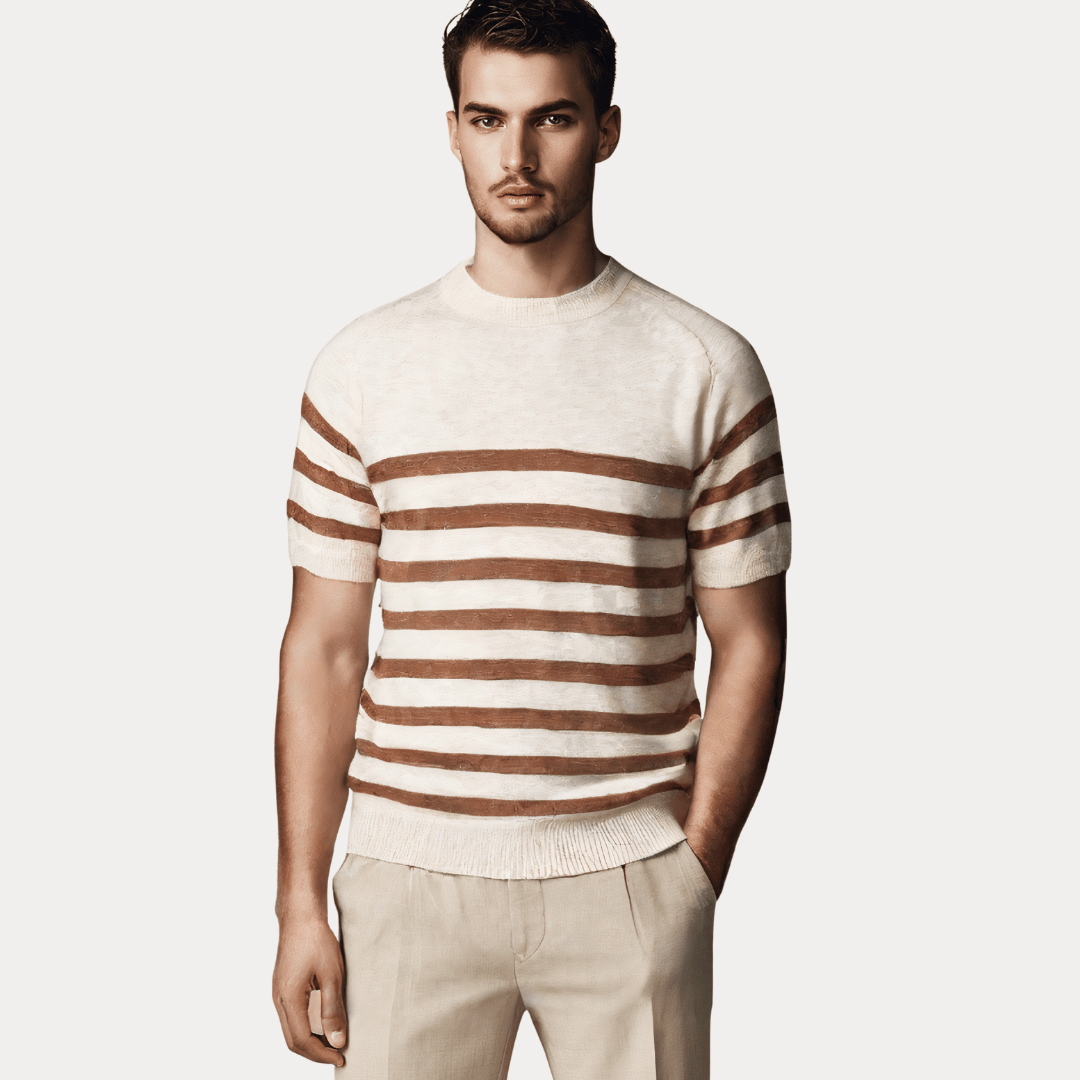 Design girocollo con strisce orizzontali. Linea regolare. Orlo delle maniche a costine. Girocollo a costine. Texture morbida e traspirante. Tessuto 75% Cotone e 25% Lino. Vestibilità regolare e fresca.