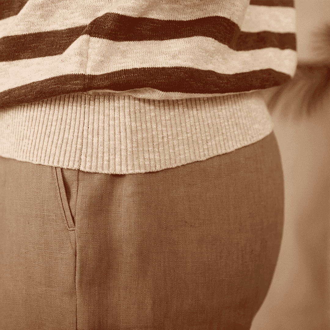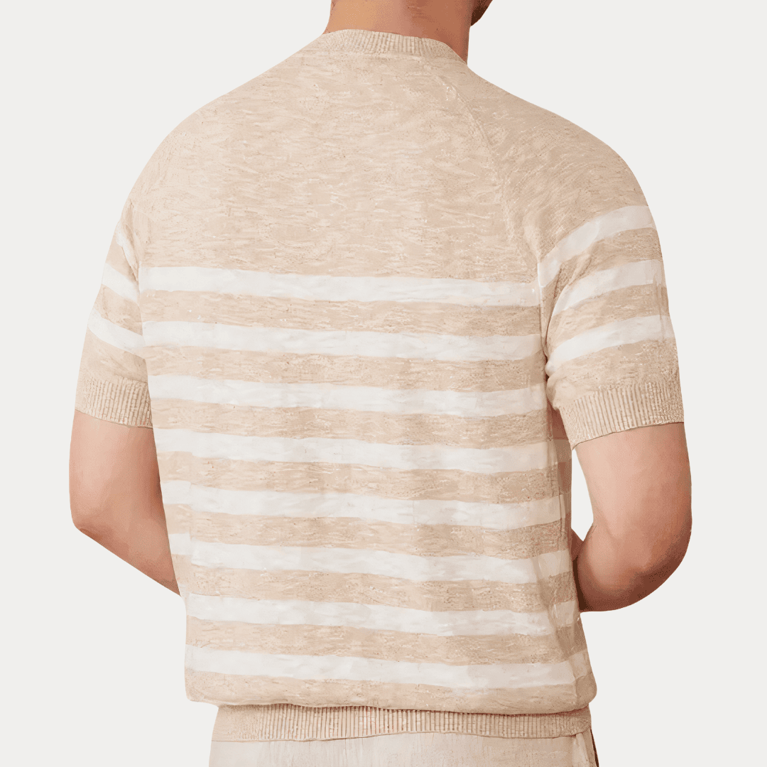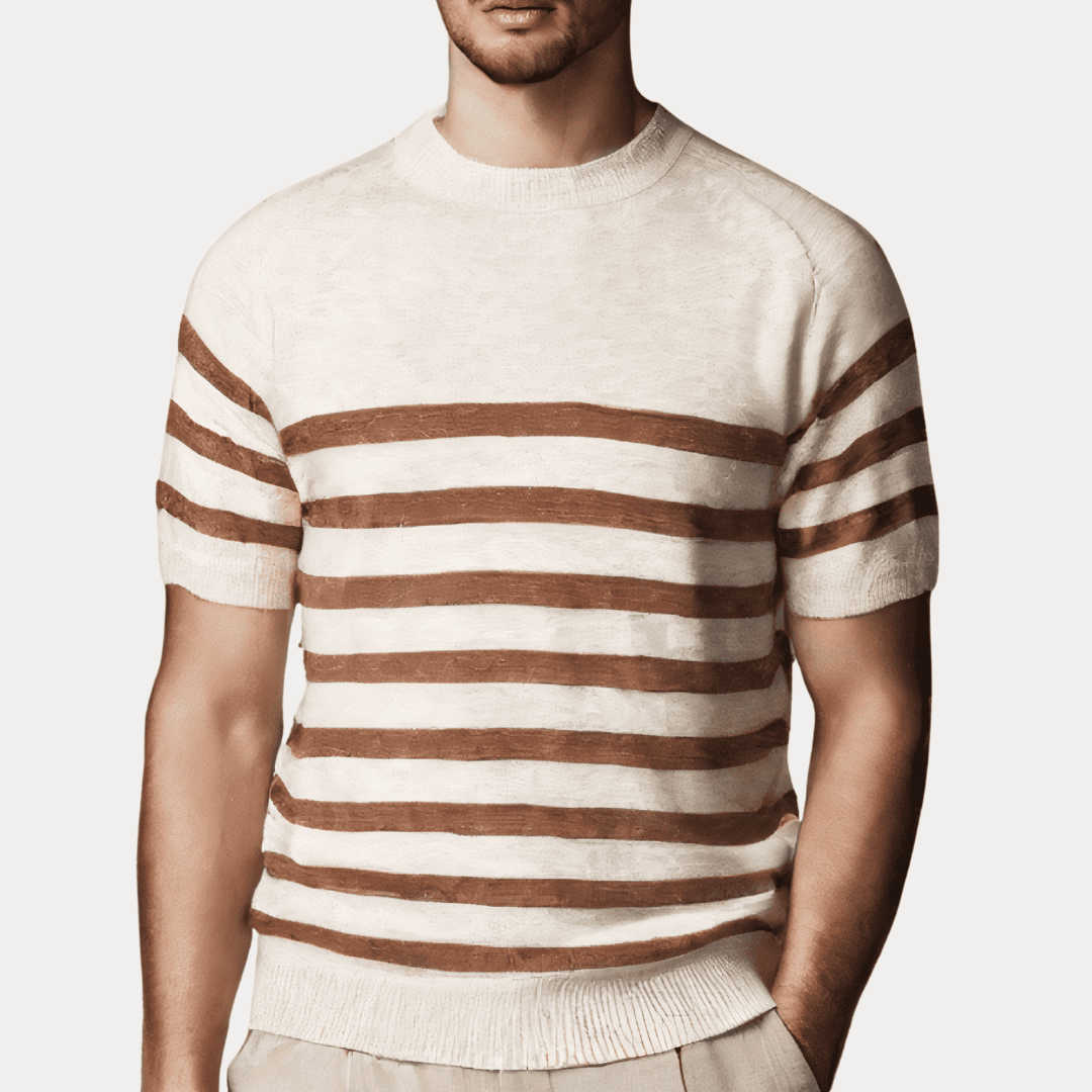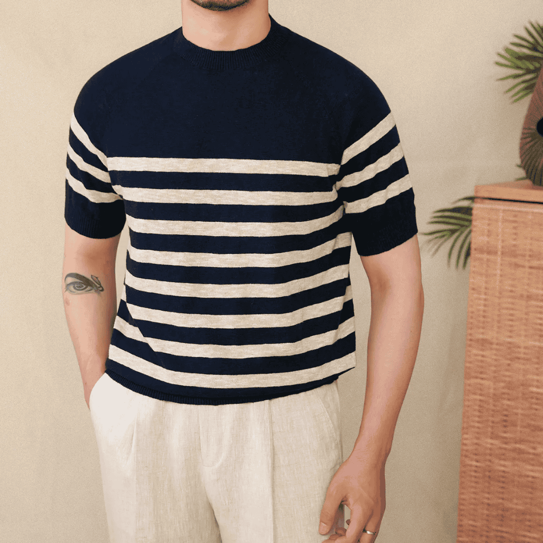 Design girocollo con strisce orizzontali. Linea regolare. Orlo delle maniche a costine. Girocollo a costine. Texture morbida e traspirante. Tessuto 75% Cotone e 25% Lino. Vestibilità regolare e fresca.